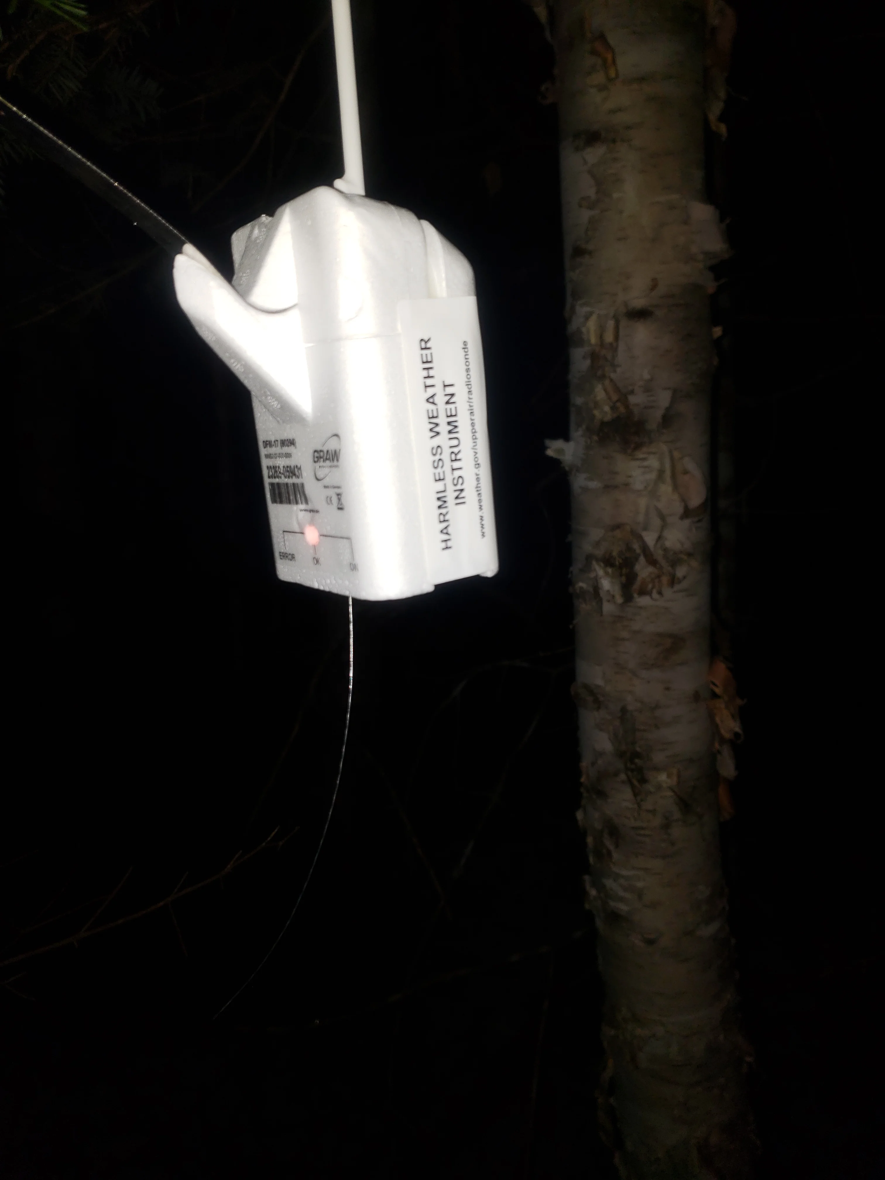 Once I got within about 50 feet of the radiosonde, I saw a tiny red light in the distance. This was the radiosonde! I was relieved by this - my previous attempt had failed right at the end, when actually trying to find the device. Walking up to it, it was about 10 feet up in a tree. I was able to knock it down using my antenna as a long stick. I was very glad to bring it at that point, even if I didn't need it to locate the radiosonde.