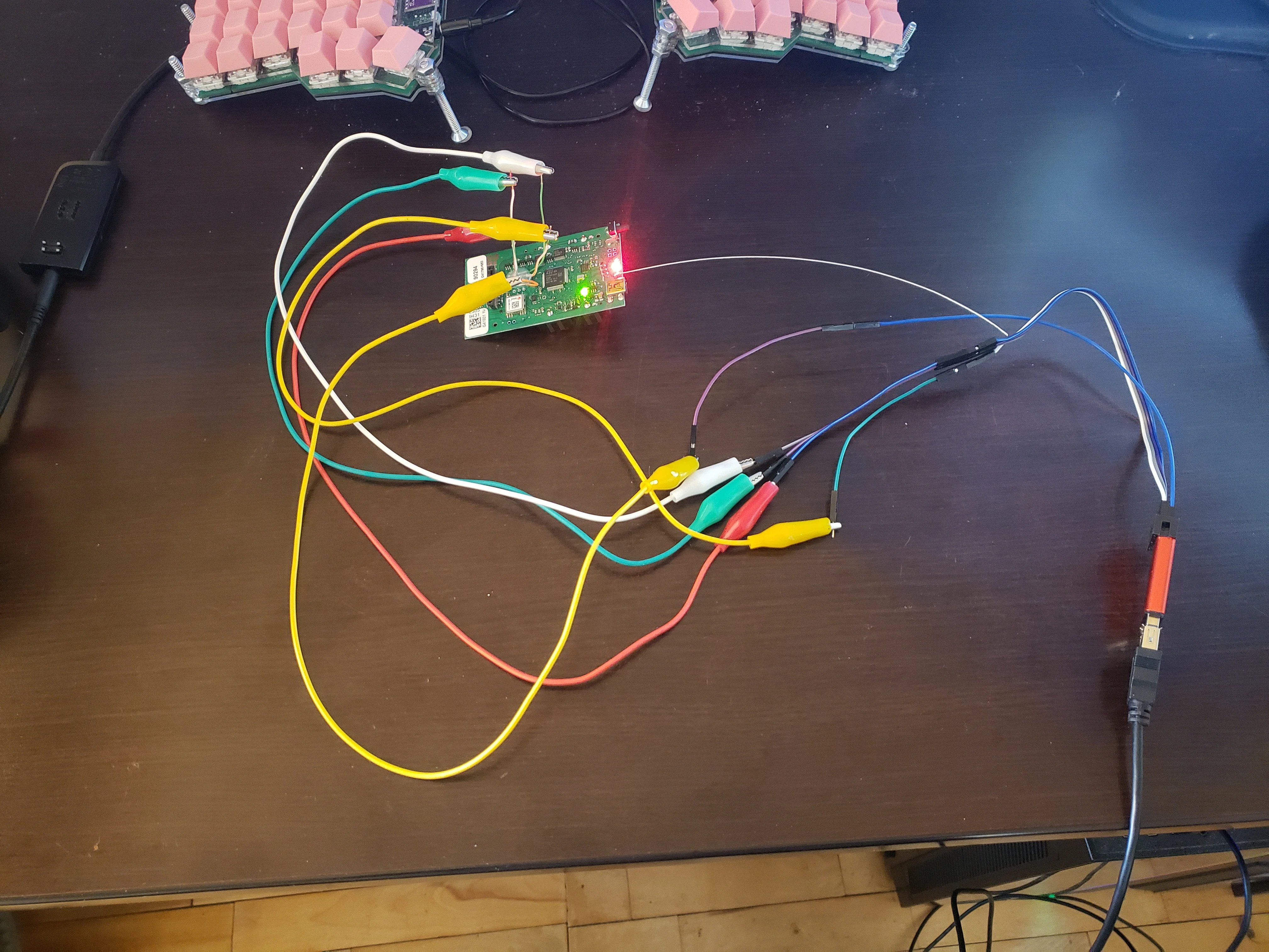 After a night of rest, I was ready to being hacking on the radiosonde. To be clear, the radiosonde is disposable and they don't want it back - there's a sticker on the device confirming this. I soldered a few wires onto its programming pads and hooked it up to a programmer.